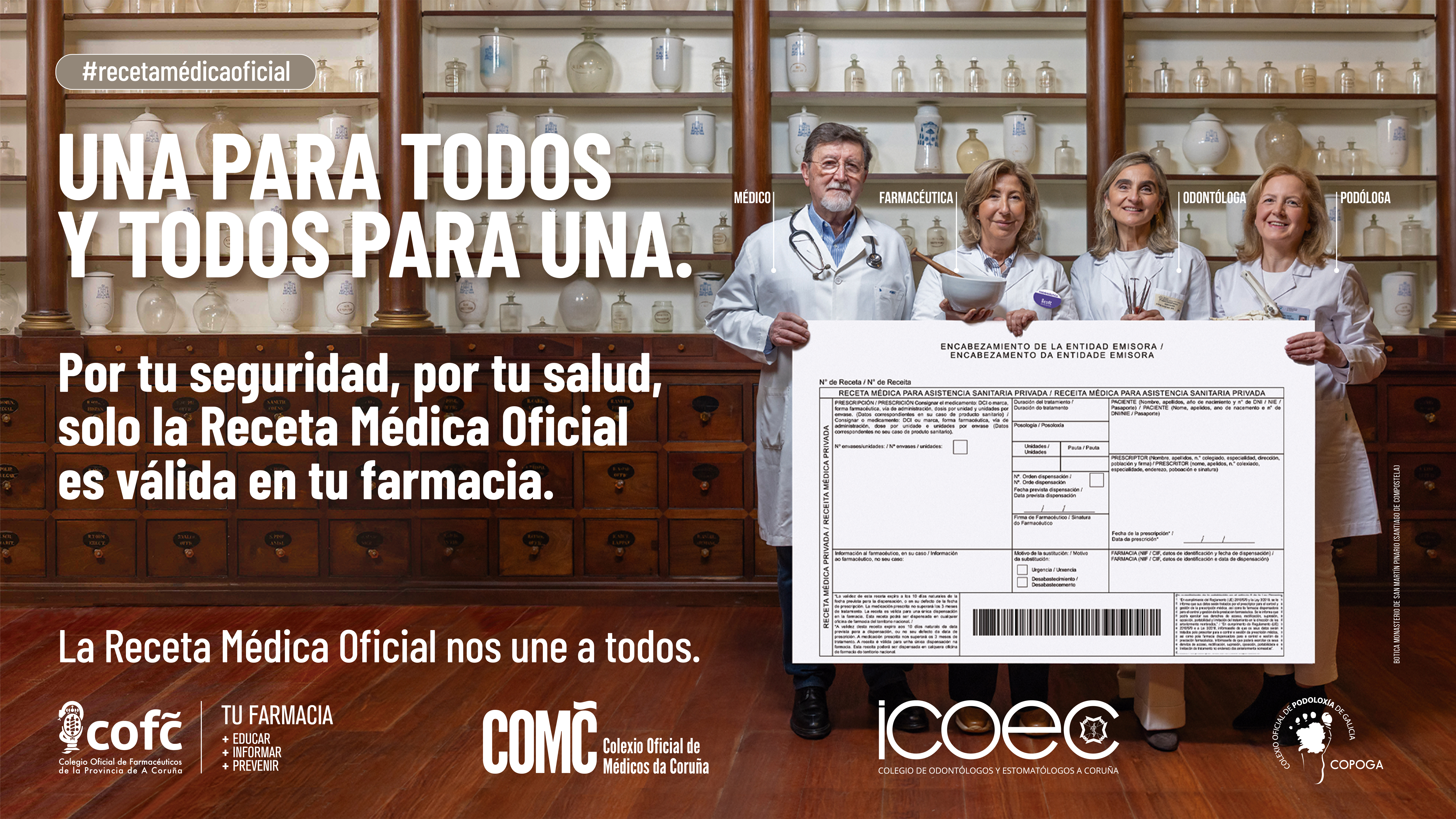 En las próximas semanas el colectivo farmacéutico coruñés hará un importante esfuerzo de difusión de los mensajes de esta campaña, denominada “Todos para una y una para todos” y recuerda que la receta médica es un requisito exigido para determinados medicamentos que presentan el icono de un círculo cerrado en su cartonaje y la leyenda “medicamento sujeto a prescripción médica”. Esta debe acreditarse, bien con la prescripción electrónica, o bien con una receta reglamentariamente cumplimentada en papel.